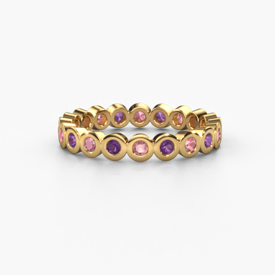 This is our Edwina 1 ring. This specific type is called an eternity ring and it is set with a continuous line of identically cut gemstones. The ring is made in 14 Carat gold and is set with small tourmaline pink, 2 mm. This gold Eternity ring is a perfectly beautiful and meaningful way to give your proposal that special touch. The magnificent evenly shaped tourmaline pink are pave set around the ring. The identical tourmaline pink are carefully selected to give the ring a maximum effect. Do keep in mind we use natural resources so small differences between stones are common. The special effect is enhanced due to precise positioning of the tourmaline pink. This requires the utmost precision and a skillful hand but for our skilled artisans this is what excites them. The result is a stackable ring with a row of tourmaline pink which seem to have no beginning nor end. The perfect symbol of your love for her! Isn't she a beauty?By using our modern techniques, we can design and customize the finest quality jewels with the utmost care for you. Our rings are always priced 30 percent lower than other jewelers. We make rings to order, so we don't have to maintain a large stock. If you have a certain budget, we are more than happy to advice you accordingly.New jewelry designs are added to our online collection daily. Our team of passionate designers strive to create extraordinary and diverse designs. Have you seen a ring you like? Please feel free to contact us. Based on a good price/ quality ratio, we will make you an offer you can't refuse!To make it easier for you, we offer a 30 day return policy. Check our terms and conditions.