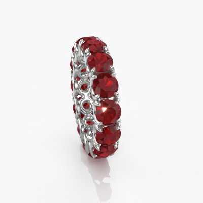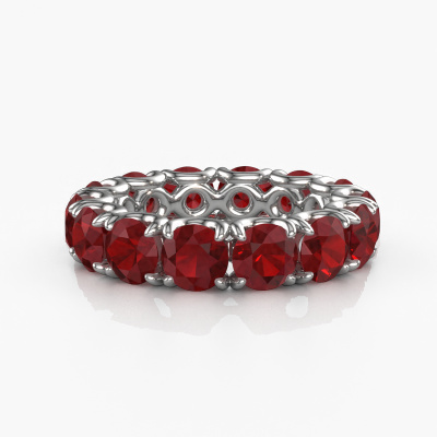 This is our Estee 5.0 ring. This specific type is called an eternity ring and it is set with a continuous line of identically cut gemstones. The ring is made in 14 Carat white gold and is set with small ruby, 5 mm. The amazing ruby are identical in size and are set in the ring band. Our ruby are selected with great care so they are identical, which gives the best result. In order to get the best result, our artisans position all ruby by hand with the utmost care. Our Goldsmiths have one ambition, which is creating the perfect ring. That is why we love what we do. In the end you get a stunning exclusive white gold ring with a row of ruby which seem to have no beginning nor end. The perfect symbol of your undying love for her! How special is that!Are you on a budget? Please feel free to contact us, so we can go discuss your options. We offer our rings at guaranteed best price, because we make them to order. You won't find such a price anywhere else!Our talented designers add new designs to our online collection daily. Together they create a diverse collection of the finest jewelry. If you prefer to make a ring according your own design, please feel free to request a quote. We will make you an amazing offer, based on quality and price.To make it easier for you, we offer a 30 day return policy. Check our terms and conditions.