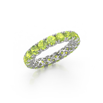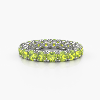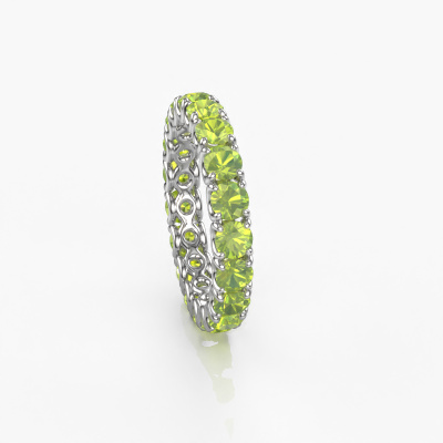 This is our Estee 3.4 ring. This specific type is called an eternity ring and it is set with a continuous line of identically cut gemstones. The ring is made in 14 Carat white gold and is set with small peridot, 3.4 mm. The amazing peridot are identical in size and are set in the ring band. Our peridot are selected with great care so they are identical, which gives the best result. In order to get the best result, our artisans position all peridot by hand with the utmost care. Our Goldsmiths have one ambition, which is creating the perfect ring. That is why we love what we do. In the end you get a stunning modern white gold stackable ring with a row of peridot which seem to have no beginning nor end. The perfect symbol of your undying love for her! How special is that!By using a combination of the latest modern techniques, combined with ancient crafting, we can make all our rings in our own studio. Each jewel is made to order. This is advantageous because we can offer you a price you won't find anywhere else.