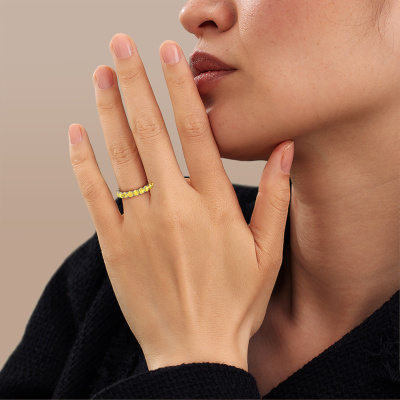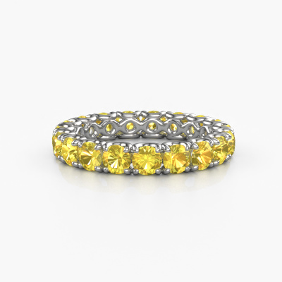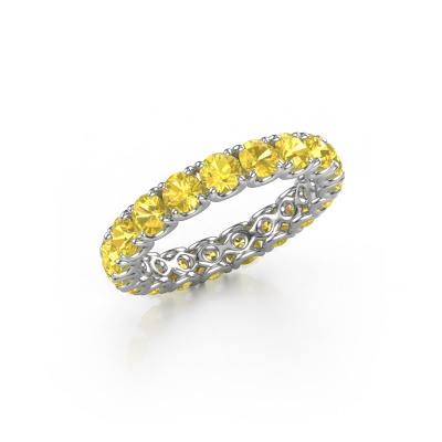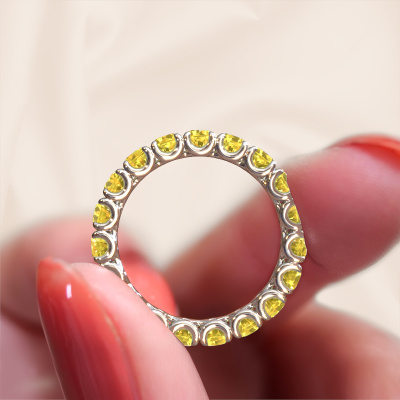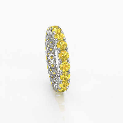 This is our Estee 3.4 ring. This specific type is called an eternity ring and it is set with a continuous line of identically cut gemstones. The ring is made in 14 Carat white gold and is set with small yellow sapphire, 3.4 mm. The amazing yellow sapphire are identical in size and are set in the ring band. Our yellow sapphire are selected with great care so they are identical, which gives the best result. In order to get the best result, our artisans position all yellow sapphire by hand with the utmost care. Our Goldsmiths have one ambition, which is creating the perfect ring. That is why we love what we do. In the end you get a stunning modern white gold stackable ring with a row of yellow sapphire which seem to have no beginning nor end. The perfect symbol of your undying love for her! How special is that!By using a combination of the latest modern techniques, combined with ancient crafting, we can make all our rings in our own studio. Each jewel is made to order. This is advantageous because we can offer you a price you won't find anywhere else.