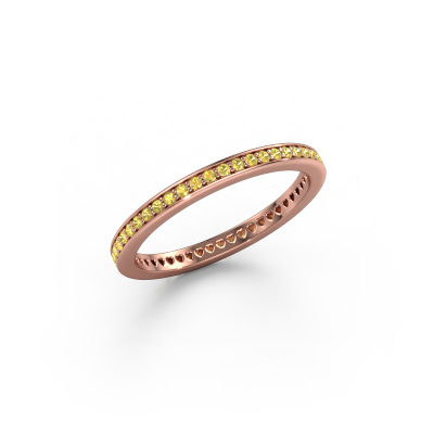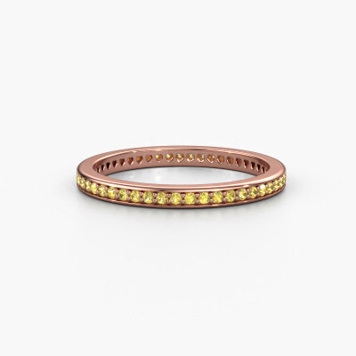 This is our Elvire 1 ring. This specific type is called an eternity ring and it is set with a continuous line of identically cut gemstones. The ring is made in 14 Carat rose gold and is set with small yellow sapphire, 1.1 mm. This rose gold Eternity ring is a perfectly beautiful and meaningful way to give your proposal that special touch. The magnificent evenly shaped yellow sapphire are pave set around the ring. The identical yellow sapphire are carefully selected to give the ring a maximum effect. Do keep in mind we use natural resources so small differences between stones are common. The special effect is enhanced due to precise positioning of the yellow sapphire. This requires the utmost precision and a skillful hand but for our skilled artisans this is what excites them. The result is a stackable ring with a row of yellow sapphire which seem to have no beginning nor end. The perfect symbol of your love for her! Isn't she a beauty?After receiving your order, our goldsmiths will start the creative process of making your Elvire 1 ring. We don't keep stock. This is advantageous because these costs will not be passed on to you. Therefore, we can offer jewelry at exceptionally low prices.New jewelry designs are added to our online collection daily. Our team of passionate designers strive to create extraordinary and diverse designs. Have you seen a ring you like? Please feel free to contact us. Based on a good price/ quality ratio, we will make you an offer you can't refuse!To make it easier for you, we offer a 30 day return policy. Check our terms and conditions.