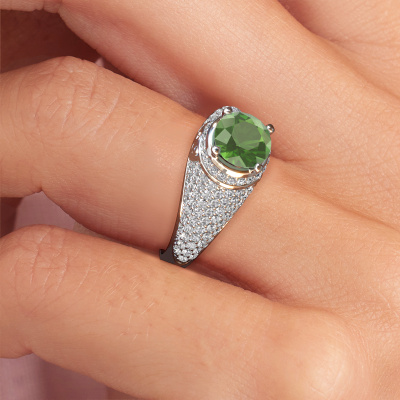 This exclusive platinum Sharee ring is a true work of art! This ring is made of platinum and is set with 6.5 mm round tourmaline green. The smallest ornaments are crafted by our goldsmith with a lot of patience and great passion. In order to create this ring with great precision, this craft requires a keen eye and a skillful hand. A challenge which ignites a fire in our expert goldsmiths. The exquisite tourmaline green are set in a way that their unique qualities are strengthened. This gives the ring an even more glamorous appearance. The ring is unique by itself though, because of the natural birthstones we selected especially for this Sharee ring. And by choosing the precious metal yourself, you create a unique ring. The special sharee ring, as shown here, can be customized to your liking. Our online tool offers many different options but please feel free to contact us if you want changes made to your sharee ring, which are unavailable in our online tool.Because we design and deliver our own rings, we can offer you a ring at a price you won't find anywhere else. A ring is made to order, which helps prevent excess supplies, so we can make you a great price offer. We understand it feels risky, buying your ring online, but we will gladly assist in the designing process, taking your budget into consideration.To make it easier for you, we offer a 30 day return policy. Check our terms and conditions.
