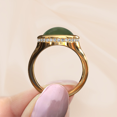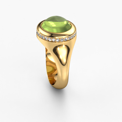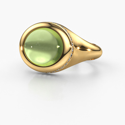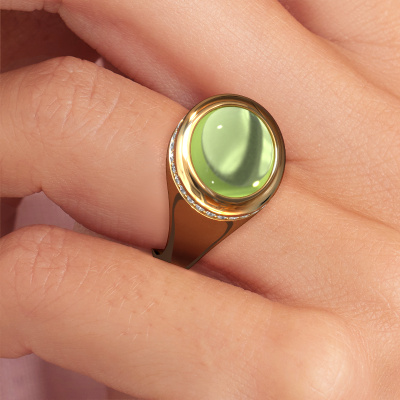 In this photo the gold Lesli OVL ring is set with a cabochon peridot. Cabochon means a peridot is shaped first, not faceted, into a specific shape, such as a drop, heart or oval cabochon. Subsequently, it is polished until the gemstone has a orb shaped surface. A cabochon gemstone is a stunning, classy eye-catcher that matches perfectly with a contemporary as well as a vintage style. Our expert goldsmiths shape the fashionable ring to perfection which makes it unique. The cabochon peridot is set so its unique qualities are strengthened. How do you like this modern gold ring? Simply customize this Lesli OVL ring, using our online tool. Subsequently, your personal fashionable Lesli OVL ring will be made by hand by our goldsmiths. Precious metals and gemstones can be customized to your liking. Do you have specific preferences which are unavailable in our online tool? Please feel free to contact us. We will customize your personal modern ring to your liking.By using a combination of the latest modern techniques, combined with ancient crafting, we can make all our rings in our own studio. Each jewel is made to order. This is advantageous because we can offer you a price you won't find anywhere else.To make it easier for you, we offer a 30 day return policy. Check our terms and conditions.