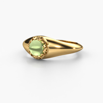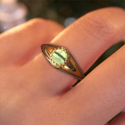 In this photo the gold Birgit ring is set with a cabochon peridot. Cabochon means a peridot is shaped first, not faceted, into a specific shape, such as a drop, heart or round cabochon. Subsequently, it is polished until the gemstone has a orb shaped surface. A cabochon gemstone is a stunning, classy eye-catcher that matches perfectly with a contemporary as well as a vintage style. Our expert goldsmiths shape the royal ring to perfection which makes it unique. The cabochon peridot is set so its unique qualities are strengthened. The royal Birgit ring, as shown here, can be customized to your liking. Our online tool offers many different options but please feel free to contact us if you want changes made to your Birgit ring, which are unavailable in our online tool.Because we design and deliver our own rings, we can offer you a ring at a price you won't find anywhere else. A ring is made to order, which helps prevent excess supplies, so we can make you a great price offer. We understand it feels risky, buying your ring online, but we will gladly assist in the designing process, taking your budget into consideration.To make it easier for you, we offer a 30 day return policy. Check our terms and conditions.
