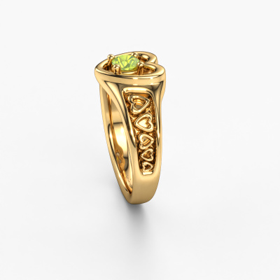 This symbolic gold Eura ring is set with peridot. For some, a ring is nothing more than a beautiful fashion item but they can become a meaningful keepsake. A ring such as this can be worn daily and it matches numerous different styles. Designing your own unique ring, makes it even more special. You are reminded of its uniqueness every time you look at it. Perhaps it reminds you of someone special. It might bring back memories. Unforgettable moments, represented in one ring. The beauty of it all is that the used precious metals and gemstones will last a lifetime. A lifetime of memories deserves nothing less! The best part of this symbolic ring is that you can customize it to your own liking. Your style, your choice, your ring. On top of that, your fantasy gold ring will be made by hand with eco-friendly materials! Please feel free to easily customize the ring, using our online tool.Because we design and deliver our own rings, we can offer you a ring at a price you won't find anywhere else. A ring is made to order, which helps prevent excess supplies, so we can make you a great price offer. We understand it feels risky, buying your ring online, but we will gladly assist in the designing process, taking your budget into consideration.To make it easier for you, we offer a 30 day return policy. Check our terms and conditions.