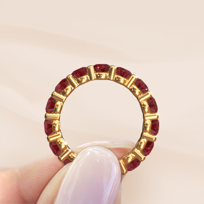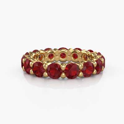 This exclusive gold Heddy rnd 4.2 ring is a true work of art! This ring is made of 14 Carat gold and is set with 4.2 mm round ruby. The smallest ornaments are crafted by our goldsmith with a lot of patience and great passion. In order to create this ring with great precision, this craft requires a keen eye and a skillful hand. A challenge which ignites a fire in our expert goldsmiths. The exquisite ruby are set in a way that their unique qualities are strengthened. This gives the ring an even more glamorous appearance. The ring is unique by itself though, because of the natural birthstones we selected especially for this Heddy rnd 4.2 ring. And by choosing the precious metal yourself, you create a unique ring. The best part of this eternity ring is that you can customize it to your own liking. Your style, your choice, your ring. On top of that, your exclusive gold ring will be made by hand with eco-friendly materials! Please feel free to easily customize the ring, using our online tool.After receiving your order, our goldsmiths will start the creative process of making your Heddy rnd 4.2 ring. We don't keep stock. This is advantageous because these costs will not be passed on to you. Therefore, we can offer jewelry at exceptionally low prices.To make it easier for you, we offer a 30 day return policy. Check our terms and conditions.