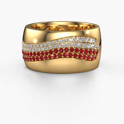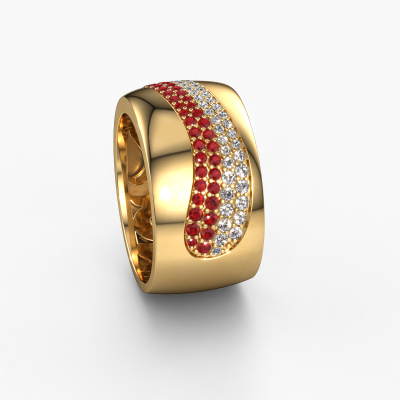 This ring is called Ria. It is made of 14 Carat gold and is set with 1 mm ruby. Are you looking for a unique gold ring with a modern appearance? Then this is the ring for you. Simply customize to your or her liking. Perfect for a modern, contemporary woman! This wide ring is adorned with stunning ruby. It was carefully selected because your ring must be adorned with nothing but the most beautiful gemstones. Our expert goldsmith will create your ring in our own studio, where the ruby will be set with great care. The ring will then be polished to perfection to create a beautiful ring. Are you on a budget? Please feel free to contact us, so we can go discuss your options. We offer our rings at guaranteed best price, because we make them to order. You won't find such a price anywhere else!