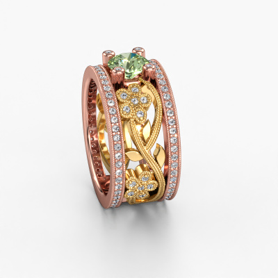 Do you have a vintage fetish? Then this rose gold Severine ring suits you perfectly. It's a contemporary design, based on vintage designs. A slightly romantic, extraordinary design! Even more when you customize to your liking. This graceful ring is set with exquisite green lab grown diamondd. As you can see, you can simply choose a gemstone that matches your style. Each gemstone is carefully selected by our merchants whom are spread throughout the world. Nothing but the best gems for our expert goldsmith! After all, it is his crowning glory!Our goldsmiths passionately create your customized ring to your liking with the utmost care. The rose gold ring, as shown here, can be customized using our online tool. Feel free to ask our jewel designers for assistance if you want changes made which are unavailable in our online tool. We are happy to answer your questions.After receiving your order, our goldsmiths will passionately start the creative process of making your ring in our own studio. Because we don't have a big stockpile, these costs will not be passed on to you. Our pricing is proof of that! We offer top quality jewels at lowest price, guaranteed.To make it easier for you, we offer a 30 day return policy. Check our terms and conditions.