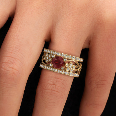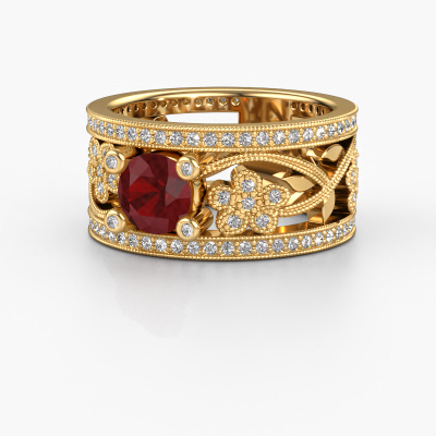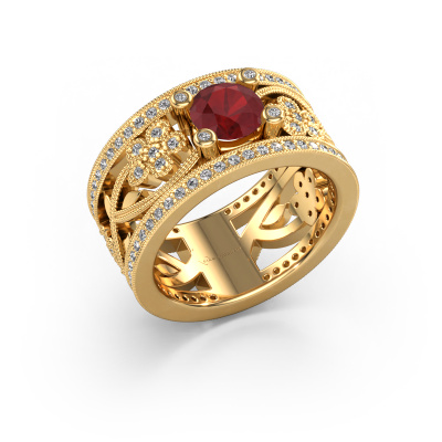 Do you have a vintage fetish? Then this gold Severine ring suits you perfectly. It's a contemporary design, based on vintage designs. A slightly romantic, extraordinary design! Even more when you customize to your liking. This graceful ring is set with exquisite ruby. As you can see, you can simply choose a gemstone that matches your style. Each gemstone is carefully selected by our merchants whom are spread throughout the world. Nothing but the best gems for our expert goldsmith! After all, it is his crowning glory!Our goldsmiths passionately create your customized ring to your liking with the utmost care. The gold ring, as shown here, can be customized using our online tool. Feel free to ask our jewel designers for assistance if you want changes made which are unavailable in our online tool. We are happy to answer your questions.After receiving your order, our goldsmiths will passionately start the creative process of making your ring in our own studio. Because we don't have a big stockpile, these costs will not be passed on to you. Our pricing is proof of that! We offer top quality jewels at lowest price, guaranteed.To make it easier for you, we offer a 30 day return policy. Check our terms and conditions.