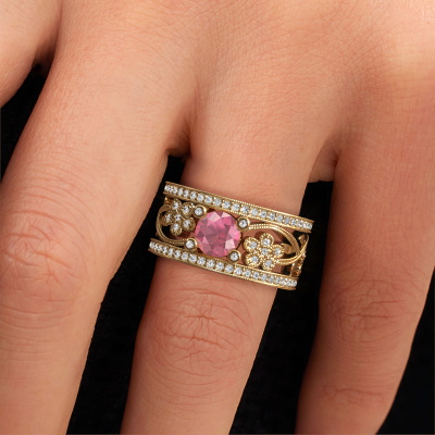 Do you have a vintage fetish? Then this gold Severine ring suits you perfectly. It's a contemporary design, based on vintage designs. A slightly romantic, extraordinary design! Even more when you customize to your liking. This graceful ring is set with exquisite tourmaline pink. As you can see, you can simply choose a gemstone that matches your style. Each gemstone is carefully selected by our merchants whom are spread throughout the world. Nothing but the best gems for our expert goldsmith! After all, it is his crowning glory!Our goldsmiths passionately create your customized ring to your liking with the utmost care. The gold ring, as shown here, can be customized using our online tool. Feel free to ask our jewel designers for assistance if you want changes made which are unavailable in our online tool. We are happy to answer your questions.After receiving your order, our goldsmiths will passionately start the creative process of making your ring in our own studio. Because we don't have a big stockpile, these costs will not be passed on to you. Our pricing is proof of that! We offer top quality jewels at lowest price, guaranteed.To make it easier for you, we offer a 30 day return policy. Check our terms and conditions.