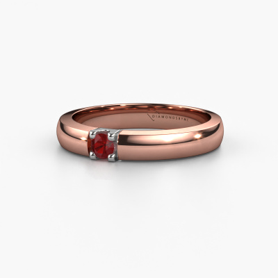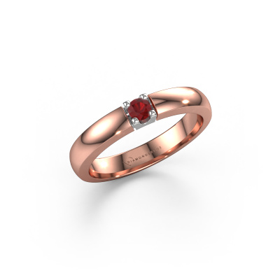 This extraordinary ring is called Rianne 1. This type of ring is known as a memoire ring, because it's birthstones are set in a continuous line. This makes it easy to combine with other rings. The band of this 14 Carat rose gold ring is set in a combination of ruby and ruby 3 mm. You can easily choose the combination you prefer online. As you can see, a single ruby is set in this single alliance rose gold ring. The memoire ring represents collaboration. And that is precisely what these gemstones do, collaborate. Together they add a beautiful effect to the band of a classic ring! Such a meaningful ring, wouldn't you agree? All of our hand selected ruby are positioned by hand by our expert goldsmith. It's a precise task, which can only be completed successfully through the combination of pure craftsmanship and usage of the latest techniques which give it an optimal effect. To create a perfect reflection of light, all the gemstones have to be perfectly aligned in the same way. During manufacturing, the expert goldsmith will therefore monitor the reflection of light constantly to check whether the ruby are aligned properly. This requires a skilled hand and a lot of patience but then the end product will be a true piece of art. And that is our mission!By using a combination of the latest modern techniques, combined with ancient crafting, we can make all our rings in our own studio. Each jewel is made to order. This is advantageous because we can offer you a price you won't find anywhere else.Our team of talented, passionate designers add new ring designs to our online collection daily. Our objective in doing so, is to be able to offer you a wide variety of jewels. Please feel free to request a quote if you have specific wishes for your ring. We guarantee to make you an offer you can't refuse.To make it easier for you, we offer a 30 day return policy. Check our terms and conditions.