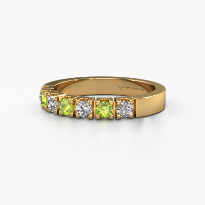 This extraordinary ring is called Dana 7. This type of ring is known as a memoire ring, because its gemstones are set in a continuous line. This makes it easy to combine with other rings. The band of this 14 Carat gold ring is set in a combination of peridot and lab-grown diamond 3 mm. You can easily choose the combination you prefer online. As you can see, a single peridot is set in this single alliance gold ring. The memoire ring represents collaboration. And that is precisely what these gemstones do, collaborate. Together they add a beautiful effect to the band of a modern ring! Such a meaningful ring, wouldn't you agree? All of our hand selected peridot are positioned by hand by our expert goldsmith. It's a precise task, which can only be completed successfully through the combination of pure craftsmanship and usage of the latest techniques which give it an optimal effect. To create a perfect reflection of light, all the gemstones have to be perfectly aligned in the same way. During manufacturing, the expert goldsmith will therefore monitor the reflection of light constantly to check whether the peridot are aligned properly. This requires a skilled hand and a lot of patience but then the end product will be a true piece of art. And that is our mission!After receiving your order, our goldsmiths will passionately start the creative process of making your ring in our own studio. Because we don't have a big stockpile, these costs will not be passed on to you. Our pricing is proof of that! We offer top quality jewels at lowest price, guaranteed.Our team of talented, passionate designers add new ring designs to our online collection daily. Our objective in doing so, is to be able to offer you a wide variety of jewels. Please feel free to request a quote if you have specific wishes for your ring. We guarantee to make you an offer you can't refuse.To make it easier for you, we offer a 30 day return policy. Check our terms and conditions.