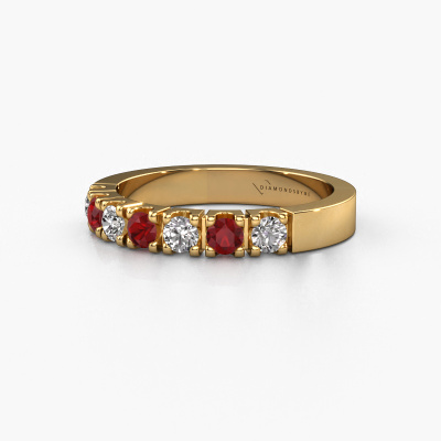 This extraordinary ring is called Dana 7. This type of ring is known as a memoire ring, because its gemstones are set in a continuous line. This makes it easy to combine with other rings. The band of this 14 Carat gold ring is set in a combination of ruby and lab-grown diamond 3 mm. You can easily choose the combination you prefer online. As you can see, a single ruby is set in this single alliance gold ring. The memoire ring represents collaboration. And that is precisely what these gemstones do, collaborate. Together they add a beautiful effect to the band of a modern ring! Such a meaningful ring, wouldn't you agree? All of our hand selected ruby are positioned by hand by our expert goldsmith. It's a precise task, which can only be completed successfully through the combination of pure craftsmanship and usage of the latest techniques which give it an optimal effect. To create a perfect reflection of light, all the gemstones have to be perfectly aligned in the same way. During manufacturing, the expert goldsmith will therefore monitor the reflection of light constantly to check whether the ruby are aligned properly. This requires a skilled hand and a lot of patience but then the end product will be a true piece of art. And that is our mission!After receiving your order, our goldsmiths will passionately start the creative process of making your ring in our own studio. Because we don't have a big stockpile, these costs will not be passed on to you. Our pricing is proof of that! We offer top quality jewels at lowest price, guaranteed.Our team of talented, passionate designers add new ring designs to our online collection daily. Our objective in doing so, is to be able to offer you a wide variety of jewels. Please feel free to request a quote if you have specific wishes for your ring. We guarantee to make you an offer you can't refuse.To make it easier for you, we offer a 30 day return policy. Check our terms and conditions.