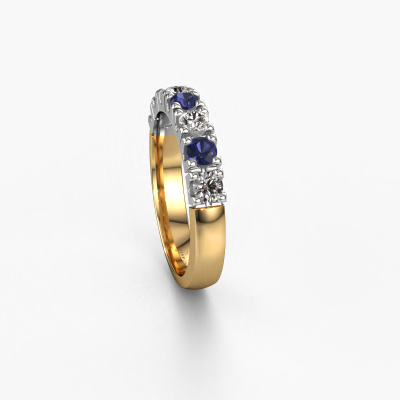 This extraordinary ring is called Rianne 7. This type of ring is known as a memoire ring, because its gemstones are set in a continuous line. This makes it easy to combine with other rings. The band of this 14 Carat gold ring is set in a combination of sapphire and lab-grown diamond 3 mm. You can easily choose the combination you prefer online. As you can see, a single sapphire is set in this single alliance gold ring. The memoire ring represents collaboration. And that is precisely what these gemstones do, collaborate. Together they add a beautiful effect to the band of a traditional ring! Such a meaningful ring, wouldn't you agree? All of our hand selected sapphire are positioned by hand by our expert goldsmith. It's a precise task, which can only be completed successfully through the combination of pure craftsmanship and usage of the latest techniques which give it an optimal effect. To create a perfect reflection of light, all the gemstones have to be perfectly aligned in the same way. During manufacturing, the expert goldsmith will therefore monitor the reflection of light constantly to check whether the sapphire are aligned properly. This requires a skilled hand and a lot of patience but then the end product will be a true piece of art. And that is our mission!Because we design and deliver our own rings, we can offer you a ring at a price you won't find anywhere else. A ring is made to order, which helps prevent excess supplies, so we can make you a great price offer. We understand it feels risky, buying your ring online, but we will gladly assist in the designing process, taking your budget into consideration.