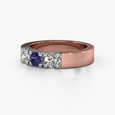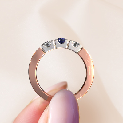 This extraordinary ring is called Dana 3. This type of ring is known as a memoire ring, because its gemstones are set in a continuous line. This makes it easy to combine with other rings. The band of this 14 Carat rose gold ring is set in a combination of sapphire and lab-grown diamond 4 mm. You can easily choose the combination you prefer online. As you can see, a single sapphire is set in this single alliance rose gold ring. The memoire ring represents collaboration. And that is precisely what these gemstones do, collaborate. Together they add a beautiful effect to the band of a modern ring! Such a meaningful ring, wouldn't you agree? All of our hand selected sapphire are positioned by hand by our expert goldsmith. It's a precise task, which can only be completed successfully through the combination of pure craftsmanship and usage of the latest techniques which give it an optimal effect. To create a perfect reflection of light, all the gemstones have to be perfectly aligned in the same way. During manufacturing, the expert goldsmith will therefore monitor the reflection of light constantly to check whether the sapphire are aligned properly. This requires a skilled hand and a lot of patience but then the end product will be a true piece of art. And that is our mission!After receiving your order, our goldsmiths will passionately start the creative process of making your ring in our own studio. Because we don't have a big stockpile, these costs will not be passed on to you. Our pricing is proof of that! We offer top quality jewels at lowest price, guaranteed.Our talented designers add new designs to our online collection daily. Together they create a diverse collection of the finest jewelry. If you prefer to make a ring according your own design, please feel free to request a quote. We will make you an amazing offer, based on quality and price.To make it easier for you, we offer a 30 day return policy. Check our terms and conditions.