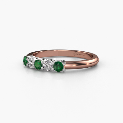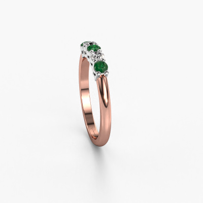 This extraordinary ring is called Michelle 5. This type of ring is known as a memoire ring, because its gemstones are set in a continuous line. This makes it easy to combine with other rings. The band of this 14 Carat rose gold ring is set in a combination of emerald and lab-grown diamond 3 mm. You can easily choose the combination you prefer online. As you can see, a single emerald is set in this single alliance rose gold ring. The memoire ring represents collaboration. And that is precisely what these gemstones do, collaborate. Together they add a beautiful effect to the band of a classic ring! Such a meaningful ring, wouldn't you agree? All of our hand selected emeralds are positioned by hand by our expert goldsmith. It's a precise task, which can only be completed successfully through the combination of pure craftsmanship and usage of the latest techniques which give it an optimal effect. To create a perfect reflection of light, all the gemstones have to be perfectly aligned in the same way. During manufacturing, the expert goldsmith will therefore monitor the reflection of light constantly to check whether the emeralds are aligned properly. This requires a skilled hand and a lot of patience but then the end product will be a true piece of art. And that is our mission!Are you on a budget? Please feel free to contact us, so we can go discuss your options. We offer our rings at guaranteed best price, because we make them to order. You won't find such a price anywhere else!