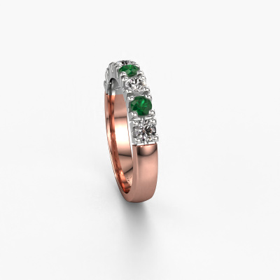 This extraordinary ring is called Rianne 7. This type of ring is known as a memoire ring, because its gemstones are set in a continuous line. This makes it easy to combine with other rings. The band of this 14 Carat rose gold ring is set in a combination of emerald and lab-grown diamond 3 mm. You can easily choose the combination you prefer online. As you can see, a single emerald is set in this single alliance rose gold ring. The memoire ring represents collaboration. And that is precisely what these gemstones do, collaborate. Together they add a beautiful effect to the band of a traditional ring! Such a meaningful ring, wouldn't you agree? All of our hand selected emeralds are positioned by hand by our expert goldsmith. It's a precise task, which can only be completed successfully through the combination of pure craftsmanship and usage of the latest techniques which give it an optimal effect. To create a perfect reflection of light, all the gemstones have to be perfectly aligned in the same way. During manufacturing, the expert goldsmith will therefore monitor the reflection of light constantly to check whether the emeralds are aligned properly. This requires a skilled hand and a lot of patience but then the end product will be a true piece of art. And that is our mission!Because we design and deliver our own rings, we can offer you a ring at a price you won't find anywhere else. A ring is made to order, which helps prevent excess supplies, so we can make you a great price offer. We understand it feels risky, buying your ring online, but we will gladly assist in the designing process, taking your budget into consideration.