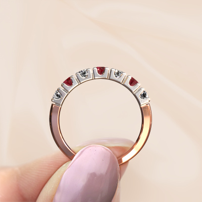 This extraordinary ring is called Rianne 7. This type of ring is known as a memoire ring, because its gemstones are set in a continuous line. This makes it easy to combine with other rings. The band of this 14 Carat rose gold ring is set in a combination of ruby and lab-grown diamond 3 mm. You can easily choose the combination you prefer online. As you can see, a single ruby is set in this single alliance rose gold ring. The memoire ring represents collaboration. And that is precisely what these gemstones do, collaborate. Together they add a beautiful effect to the band of a traditional ring! Such a meaningful ring, wouldn't you agree? All of our hand selected ruby are positioned by hand by our expert goldsmith. It's a precise task, which can only be completed successfully through the combination of pure craftsmanship and usage of the latest techniques which give it an optimal effect. To create a perfect reflection of light, all the gemstones have to be perfectly aligned in the same way. During manufacturing, the expert goldsmith will therefore monitor the reflection of light constantly to check whether the ruby are aligned properly. This requires a skilled hand and a lot of patience but then the end product will be a true piece of art. And that is our mission!Because we design and deliver our own rings, we can offer you a ring at a price you won't find anywhere else. A ring is made to order, which helps prevent excess supplies, so we can make you a great price offer. We understand it feels risky, buying your ring online, but we will gladly assist in the designing process, taking your budget into consideration.