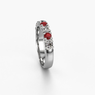 This extraordinary ring is called Rianne 7. This type of ring is known as a memoire ring, because its gemstones are set in a continuous line. This makes it easy to combine with other rings. The band of this 14 Carat white gold ring is set in a combination of ruby and lab-grown diamond 3 mm. You can easily choose the combination you prefer online. As you can see, a single ruby is set in this single alliance white gold ring. The memoire ring represents collaboration. And that is precisely what these gemstones do, collaborate. Together they add a beautiful effect to the band of a traditional ring! Such a meaningful ring, wouldn't you agree? All of our hand selected ruby are positioned by hand by our expert goldsmith. It's a precise task, which can only be completed successfully through the combination of pure craftsmanship and usage of the latest techniques which give it an optimal effect. To create a perfect reflection of light, all the gemstones have to be perfectly aligned in the same way. During manufacturing, the expert goldsmith will therefore monitor the reflection of light constantly to check whether the ruby are aligned properly. This requires a skilled hand and a lot of patience but then the end product will be a true piece of art. And that is our mission!Because we design and deliver our own rings, we can offer you a ring at a price you won't find anywhere else. A ring is made to order, which helps prevent excess supplies, so we can make you a great price offer. We understand it feels risky, buying your ring online, but we will gladly assist in the designing process, taking your budget into consideration.