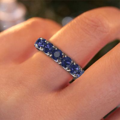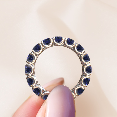 This Estee 4.2 ring in 14 Carat white gold is set with sapphire. This white gold stacked Estee 4.2 ring is the perfect addition to your ring collection! As the name suggests, it is a ring which can be combined on one finger with another ring. It gives you the opportunity to create your own style. A stacked ring usually represents a certain memory of someone special or a memorable moment. It is common to combine a stacked ring, representing an anniversary, with a wedding ring. But this eternity ring, combined with your other rings, also makes a classy fashion item. The eternity Estee 4.2 ring, as shown here, can be customized to your liking. Our online tool offers many different options but please feel free to contact us if you want changes made to your Estee 4.2 ring, which are unavailable in our online tool.After receiving your order, our goldsmiths will passionately start the creative process of making your ring in our own studio. Because we don't have a big stockpile, these costs will not be passed on to you. Our pricing is proof of that! We offer top quality jewels at lowest price, guaranteed.To make it easier for you, we offer a 30 day return policy. Check our terms and conditions.