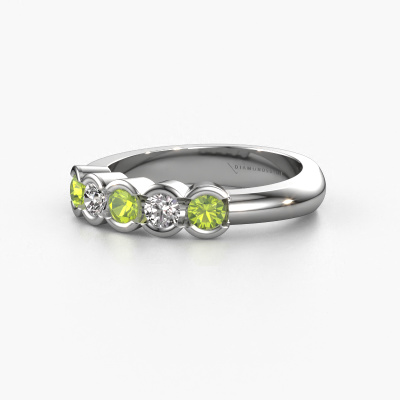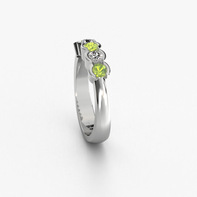 This ring is called Lotte 5. It is made of platinum and is set with 3 mm peridot. Are you looking for a unique platinum ring with a modern appearance? Then this is the ring for you. Simply customize to your or her liking. Perfect for a modern, contemporary woman! This 5 stones ring is adorned with stunning peridot. It was carefully selected because your ring must be adorned with nothing but the most beautiful gemstones. Our expert goldsmith will create your ring in our own studio, where the peridot will be set with great care. The ring will then be polished to perfection to create a beautiful ring. By using a combination of the latest modern techniques, combined with ancient crafting, we can make all our rings in our own studio. Each jewel is made to order. This is advantageous because we can offer you a price you won't find anywhere else.Our team of talented, passionate designers add new ring designs to our online collection daily. Our objective in doing so, is to be able to offer you a wide variety of jewels. Please feel free to request a quote if you have specific wishes for your ring. We guarantee to make you an offer you can't refuse.To make it easier for you, we offer a 30 day return policy. Check our terms and conditions.