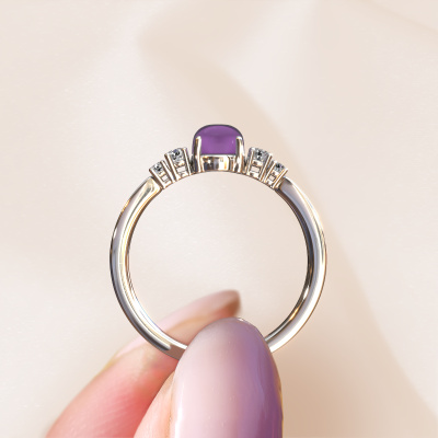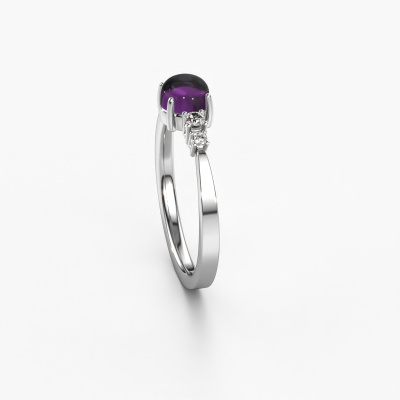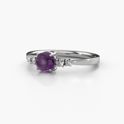 In this photo the platinum Regine ring is set with a cabochon amethyst. Cabochon means a amethyst is shaped first, not faceted, into a specific shape, such as a drop, heart or round cabochon. Subsequently, it is polished until the gemstone has a orb shaped surface. A cabochon gemstone is a stunning, classy eye-catcher that matches perfectly with a contemporary as well as a vintage style. Our expert goldsmiths shape the 5 stones ring to perfection which makes it unique. The cabochon amethyst is set so its unique qualities are strengthened. Our goldsmiths passionately create your customized ring to your liking with the utmost care. The platinum ring, as shown here, can be customized using our online tool. Feel free to ask our jewel designers for assistance if you want changes made which are unavailable in our online tool. We are happy to answer your questions.Are you on a budget? Please feel free to contact us, so we can go discuss your options. We offer our rings at guaranteed best price, because we make them to order. You won't find such a price anywhere else!To make it easier for you, we offer a 30 day return policy. Check our terms and conditions.