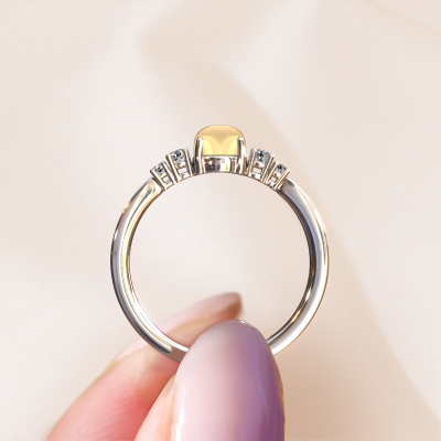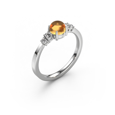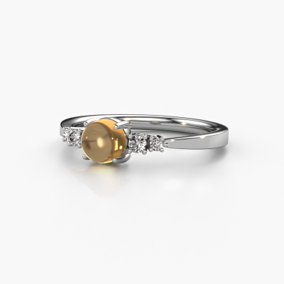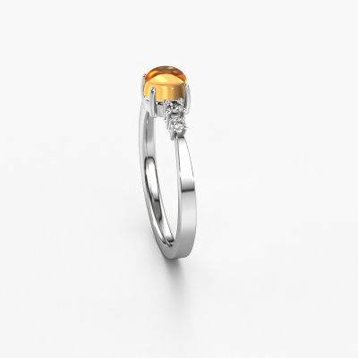 In this photo the platinum Regine ring is set with a cabochon citrin. Cabochon means a citrin is shaped first, not faceted, into a specific shape, such as a drop, heart or round cabochon. Subsequently, it is polished until the gemstone has a orb shaped surface. A cabochon gemstone is a stunning, classy eye-catcher that matches perfectly with a contemporary as well as a vintage style. Our expert goldsmiths shape the 5 stones ring to perfection which makes it unique. The cabochon citrin is set so its unique qualities are strengthened. Our goldsmiths passionately create your customized ring to your liking with the utmost care. The platinum ring, as shown here, can be customized using our online tool. Feel free to ask our jewel designers for assistance if you want changes made which are unavailable in our online tool. We are happy to answer your questions.Are you on a budget? Please feel free to contact us, so we can go discuss your options. We offer our rings at guaranteed best price, because we make them to order. You won't find such a price anywhere else!To make it easier for you, we offer a 30 day return policy. Check our terms and conditions.