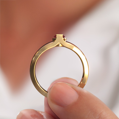 This ring is called Jade. It is made of 14 Carat rose gold and is set with 4 mm ruby. Are you looking for a unique rose gold ring with a modern appearance? Then this is the ring for you. Simply customize to your or her liking. Perfect for a modern, contemporary woman! This elegant ring is adorned with stunning ruby. It was carefully selected because your ring must be adorned with nothing but the most beautiful gemstones. Our expert goldsmith will create your ring in our own studio, where the ruby will be set with great care. The ring will then be polished to perfection to create a beautiful ring. By using a combination of the latest modern techniques, combined with ancient crafting, we can make all our rings in our own studio. Each jewel is made to order. This is advantageous because we can offer you a price you won't find anywhere else.Our team of talented, passionate designers add new ring designs to our online collection daily. Our objective in doing so, is to be able to offer you a wide variety of jewels. Please feel free to request a quote if you have specific wishes for your ring. We guarantee to make you an offer you can't refuse.To make it easier for you, we offer a 30 day return policy. Check our terms and conditions.
