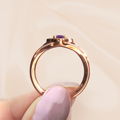 This symbolic rose gold Eura ring is set with amethyst. For some, a ring is nothing more than a beautiful fashion item but they can become a meaningful keepsake. A ring such as this can be worn daily and it matches numerous different styles. Designing your own unique ring, makes it even more special. You are reminded of its uniqueness every time you look at it. Perhaps it reminds you of someone special. It might bring back memories. Unforgettable moments, represented in one ring. The beauty of it all is that the used precious metals and gemstones will last a lifetime. A lifetime of memories deserves nothing less! The best part of this symbolic ring is that you can customize it to your own liking. Your style, your choice, your ring. On top of that, your fantasy rose gold ring will be made by hand with eco-friendly materials! Please feel free to easily customize the ring, using our online tool.Because we design and deliver our own rings, we can offer you a ring at a price you won't find anywhere else. A ring is made to order, which helps prevent excess supplies, so we can make you a great price offer. We understand it feels risky, buying your ring online, but we will gladly assist in the designing process, taking your budget into consideration.To make it easier for you, we offer a 30 day return policy. Check our terms and conditions.