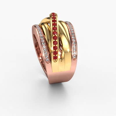 How would you describe your own style? Are you looking for something uniquely different? This special rose gold Clair 2 ring is astonishing! Simply customize to your or her own liking. This ring is set with ruby. These ruby have been carefully selected because your ring must be adorned with nothing but the most beautiful gemstone. Wouldn't you agree? Our expert goldsmith will create your ring in our own crafting studios, where the ruby will be set with care. The ring will then be polished to perfection to give it that extra sparkle. It's a perfect ring for a woman of excellent taste!As soon as you finished designing your Clair 2 ring with our online tool, our goldsmiths will start their creative process of making your ring. This will be done with passion and care, according ancient crafting. On top of that, our jewels are made of eco-friendly materials. Simply customize online with our online tool, if you want any changes made. If you want specific changes made to your Clair 2 ring, that are unavailable in our online tool, please feel free to contact our expert designers.After receiving your order, our goldsmiths will passionately start the creative process of making your ring in our own studio. Because we don't have a big stockpile, these costs will not be passed on to you. Our pricing is proof of that! We offer top quality jewels at lowest price, guaranteed.To make it easier for you, we offer a 30 day return policy. Check our terms and conditions.