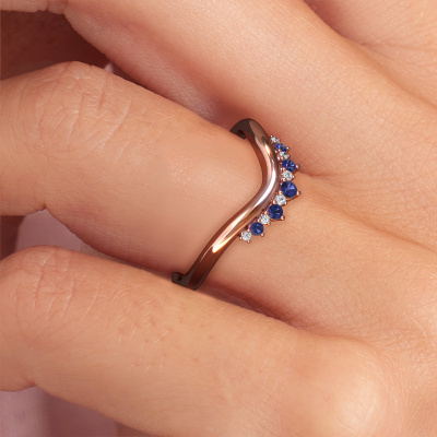 This Lyla A stackable ring in 14 Carat rose gold is set with sapphire. This rose gold stacked Lyla A ring is the perfect addition to your ring collection! As the name suggests, it is a ring which can be combined on one finger with another ring. It gives you the opportunity to create your own style. A stacked ring usually represents a certain memory of someone special or a memorable moment. It is common to combine a stacked ring, representing an anniversary, with a wedding ring. But this beautiful ring, combined with your other rings, also makes a classy fashion item. As soon as you finished designing your Lyla A stackable ring with our online tool, our goldsmiths will start their creative process of making your ring. This will be done with passion and care, according ancient crafting. On top of that, our jewels are made of eco-friendly materials. Simply customize online with our online tool, if you want any changes made. If you want specific changes made to your Lyla A stackable ring, that are unavailable in our online tool, please feel free to contact our expert designers.Because we design and deliver our own rings, we can offer you a ring at a price you won't find anywhere else. A ring is made to order, which helps prevent excess supplies, so we can make you a great price offer. We understand it feels risky, buying your ring online, but we will gladly assist in the designing process, taking your budget into consideration.To make it easier for you, we offer a 30 day return policy. Check our terms and conditions.
