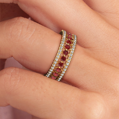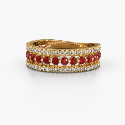 This exclusive gold Elizbeth 1 ring is a true work of art! This ring is made of 14 Carat gold and is set with 2 mm round ruby. The smallest ornaments are crafted by our goldsmith with a lot of patience and great passion. In order to create this ring with great precision, this craft requires a keen eye and a skillful hand. A challenge which ignites a fire in our expert goldsmiths. The exquisite ruby are set in a way that their unique qualities are strengthened. This gives the ring an even more glamorous appearance. The ring is unique by itself though, because of the natural birthstones we selected especially for this Elizbeth 1 ring. And by choosing the precious metal yourself, you create a unique ring. The best part of this sparkling ring is that you can customize it to your own liking. Your style, your choice, your ring. On top of that, your vintage gold ring will be made by hand with eco-friendly materials! Please feel free to easily customize the ring, using our online tool.By using a combination of the latest modern techniques, combined with ancient crafting, we can make all our rings in our own studio. Each jewel is made to order. This is advantageous because we can offer you a price you won't find anywhere else.To make it easier for you, we offer a 30 day return policy. Check our terms and conditions.