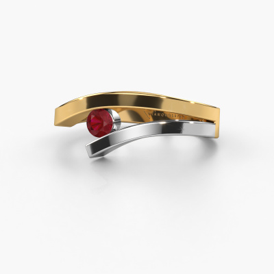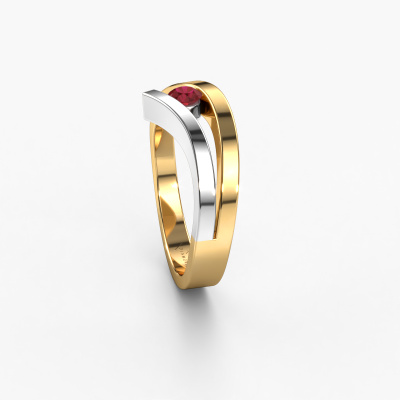 This ring called Evalyn 1 is made of 14 Carat gold and is set with ruby. Are you in the market for a unique gold ring with a modern twist? Then this ring might suit you. Simply customize to your or her liking. It suits the contemporary modern woman. This stylish ring is set with beautiful ruby. This has been carefully selected. Because your ring must be adorned with nothing but the most stunning gemstone. Our expert goldsmith will create your ring in our own studio, where the ruby will be set with great care. The ring will then be polished to perfection to create a stunning ring. By using a combination of the latest modern techniques, combined with ancient crafting, we can make all our rings in our own studio. Each jewel is made to order. This is advantageous because we can offer you a price you won't find anywhere else.New jewelry designs are added to our online collection daily. Our team of passionate designers strive to create extraordinary and diverse designs. Have you seen a ring you like? Please feel free to contact us. Based on a good price/ quality ratio, we will make you an offer you can't refuse!To make it easier for you, we offer a 30 day return policy. Check our terms and conditions.