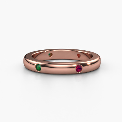 This Charla stackable ring in 14 Carat rose gold is set with emerald. This rose gold stacked Charla ring is the perfect addition to your ring collection! As the name suggests, it is a ring which can be combined on one finger with another ring. It gives you the opportunity to create your own style. A stacked ring usually represents a certain memory of someone special or a memorable moment. It is common to combine a stacked ring, representing an anniversary, with a wedding ring. But this symbolic ring, combined with your other rings, also makes a classy fashion item. The best part of this symbolic stackable ring is that you can customize it to your own liking. Your style, your choice, your stackable ring. On top of that, your trendy rose gold stackable ring will be made by hand with eco-friendly materials! Please feel free to easily customize the ring, using our online tool.By using a combination of the latest modern techniques, combined with ancient crafting, we can make all our rings in our own studio. Each jewel is made to order. This is advantageous because we can offer you a price you won't find anywhere else.To make it easier for you, we offer a 30 day return policy. Check our terms and conditions.