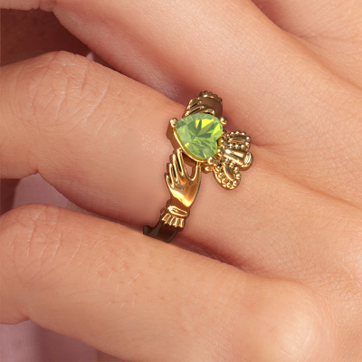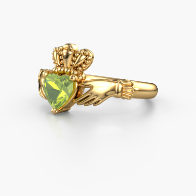 This Irish Claddagh ring is a sign of love set with a heart peridot. It is a remarkable, symbolic ring in which a crowned heart, held by two hands, is shown. The heart of a Claddagh ring is a symbol of love, the hands represent friendship and the crown, loyalty. A beautiful piece of jewelry to either give or receive! This symbolic 14 Carat gold Claddagh 2 ring is made by hand in our own studio by our expert goldsmiths. The symbolic Claddagh 2 ring, as shown here, can be customized to your liking. Our online tool offers many different options but please feel free to contact us if you want changes made to your Claddagh 2 ring, which are unavailable in our online tool.After receiving your order, our goldsmiths will start the creative process of making your Claddagh 2 ring. We don't keep stock. This is advantageous because these costs will not be passed on to you. Therefore, we can offer jewelry at exceptionally low prices.To make it easier for you, we offer a 30 day return policy. Check our terms and conditions.
