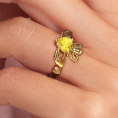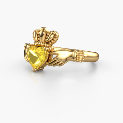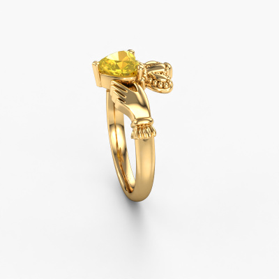 This Irish Claddagh ring is a sign of love set with a heart yellow sapphire. It is a remarkable, symbolic ring in which a crowned heart, held by two hands, is shown. The heart of a Claddagh ring is a symbol of love, the hands represent friendship and the crown, loyalty. A beautiful piece of jewelry to either give or receive! This symbolic 14 Carat gold Claddagh 2 ring is made by hand in our own studio by our expert goldsmiths. The symbolic Claddagh 2 ring, as shown here, can be customized to your liking. Our online tool offers many different options but please feel free to contact us if you want changes made to your Claddagh 2 ring, which are unavailable in our online tool.After receiving your order, our goldsmiths will start the creative process of making your Claddagh 2 ring. We don't keep stock. This is advantageous because these costs will not be passed on to you. Therefore, we can offer jewelry at exceptionally low prices.To make it easier for you, we offer a 30 day return policy. Check our terms and conditions.