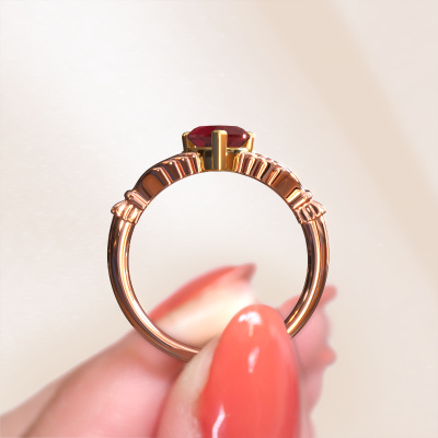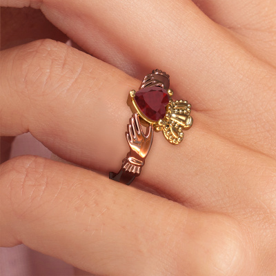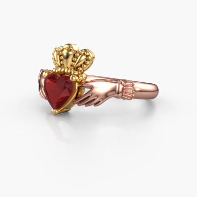 This Irish Claddagh ring is a sign of love set with a heart ruby. It is a remarkable, symbolic ring in which a crowned heart, held by two hands, is shown. The heart of a Claddagh ring is a symbol of love, the hands represent friendship and the crown, loyalty. A beautiful piece of jewelry to either give or receive! This symbolic 14 Carat rose gold Claddagh 2 ring is made by hand in our own studio by our expert goldsmiths. The symbolic Claddagh 2 ring, as shown here, can be customized to your liking. Our online tool offers many different options but please feel free to contact us if you want changes made to your Claddagh 2 ring, which are unavailable in our online tool.After receiving your order, our goldsmiths will start the creative process of making your Claddagh 2 ring. We don't keep stock. This is advantageous because these costs will not be passed on to you. Therefore, we can offer jewelry at exceptionally low prices.To make it easier for you, we offer a 30 day return policy. Check our terms and conditions.