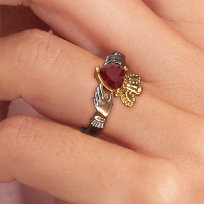This Irish Claddagh ring is a sign of love set with a heart ruby. It is a remarkable, symbolic ring in which a crowned heart, held by two hands, is shown. The heart of a Claddagh ring is a symbol of love, the hands represent friendship and the crown, loyalty. A beautiful piece of jewelry to either give or receive! This symbolic 14 Carat white gold Claddagh 2 ring is made by hand in our own studio by our expert goldsmiths. The symbolic Claddagh 2 ring, as shown here, can be customized to your liking. Our online tool offers many different options but please feel free to contact us if you want changes made to your Claddagh 2 ring, which are unavailable in our online tool.After receiving your order, our goldsmiths will start the creative process of making your Claddagh 2 ring. We don't keep stock. This is advantageous because these costs will not be passed on to you. Therefore, we can offer jewelry at exceptionally low prices.To make it easier for you, we offer a 30 day return policy. Check our terms and conditions.