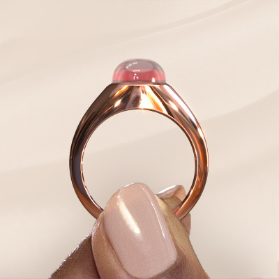 In this photo the rose gold Zaza ring is set with a cabochon tourmaline pink. Cabochon means a tourmaline pink is shaped first, not faceted, into a specific shape, such as a drop, heart or oval cabochon. Subsequently, it is polished until the gemstone has a orb shaped surface. A cabochon gemstone is a stunning, classy eye-catcher that matches perfectly with a contemporary as well as a vintage style. Our expert goldsmiths shape the 1 stone ring to perfection which makes it unique. The cabochon tourmaline pink is set so its unique qualities are strengthened. A customized design ring is the perfect gift! New exquisite designs are added daily by our team of passionate goldsmiths. And each design can be customized. Simply customize the precious metals and the color of gemstones which will be used, for example. This makes your design of the design Zaza ring truly unique!After receiving your order, our goldsmiths will start the creative process of making your Zaza ring. We don't keep stock. This is advantageous because these costs will not be passed on to you. Therefore, we can offer jewelry at exceptionally low prices.To make it easier for you, we offer a 30 day return policy. Check our terms and conditions.