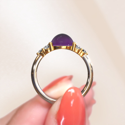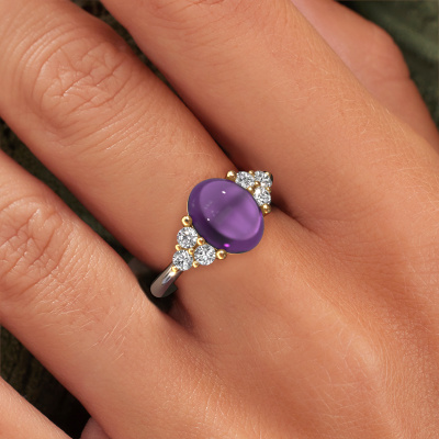 In this photo the white gold Clarice ring is set with a cabochon amethyst. Cabochon means a amethyst is shaped first, not faceted, into a specific shape, such as a drop, heart or oval cabochon. Subsequently, it is polished until the gemstone has a orb shaped surface. A cabochon gemstone is a stunning, classy eye-catcher that matches perfectly with a contemporary as well as a vintage style. Our expert goldsmiths shape the charming ring to perfection which makes it unique. The cabochon amethyst is set so its unique qualities are strengthened. Customize your own charmingClarice ring, which will then be created by our goldsmiths with great passion. Do you prefer a different option than is shown here in the white gold Clarice ring? Then our online tools offers various options. Feel free to ask us for help if you are unable to succeed. We are happy to answer your questions!By using a combination of the latest modern techniques, combined with ancient crafting, we can make all our rings in our own studio. Each jewel is made to order. This is advantageous because we can offer you a price you won't find anywhere else.To make it easier for you, we offer a 30 day return policy. Check our terms and conditions.