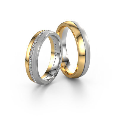 Did you know these 2 color gold eternity WH0203LM25BPM wedding rings are not just unique for their appearance but also because of their symbolism? The women's eternity wedding ring, set in a row with smaller sized diamonds of 0.01 crt, represents eternal love. The smaller sized gemstones are set in the outer ring band, so they seem to have no beginning nor end. Like your relationship, it is everlasting. In this specific set, the wedding band for men has a width of ±0.20 in (5 mm), the women´s ring has a ±0.20 in (5 mm) width and this ring, as shown here, is set with diamonds. These are set by our expert goldsmiths with great precision, so light reflects perfectly, making the ring shine even brighter. Simply customize your gemstones and colors with our online tool. Our jewel designers will make a 3D drawing of your design, so you can see the result. Our goldsmiths will subsequently make your wedding rings by hand, according ancient craftsmanship. Our goal is to make the wedding rings you have in mind. Unique wedding rings to match your style completely!After receiving your order, our goldsmiths will start the creative process of making your wedding rings. We don't keep stock. This is advantageous because these costs will not be passed on to you. Therefore, our quality wedding rings are always priced 30 percent lower than those of other jewelers.To make it easier for you, we offer a 30 day return policy. Check our terms and conditions.
