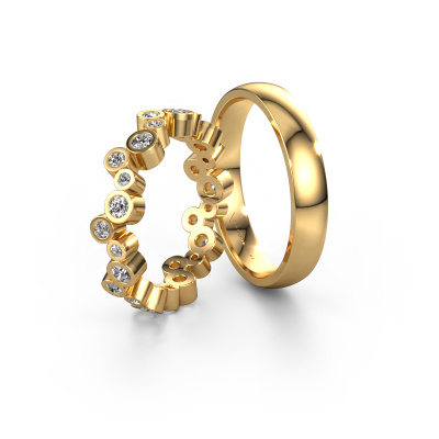 How would you describe your style? Are you looking for something slightly different? These special shiny gold WHR0052LM24AP wedding rings are remarkable rings which can be customized to your or her liking. A wedding band is a symbol of your eternal love. So, what better way to symbolize this than to customize them entirely to your liking? This unique women's wedding ring is set with aquamarine. These aquamarine are carefully selected because your wedding ring must be adorned with nothing but the most beautiful gemstones. Wouldn't you agree? The wedding band for men has a width of ±0.16 in (4 mm), the women's ring has a ±0.20 in (5 mm) width. You can choose the combination of precious metals of your preference in our online tool. Anything goes! It is wise to browse through the characteristics of each different precious metal. For example, gold and silver are softer metals. Carat is determined by the amount of added extra metals. If the goldsmith doesn't add a lot, carat is higher and the wedding rings will be softer. If he adds more metals, the jewel has a lower amount of carat. A softer precious metal can still be used for your unique wedding rings! If you prefer a precious metal which will last a lifetime, we recommend platinum. This is the most solid and durable metal our goldsmith uses.Because we design and deliver our own wedding rings, we can offer you wedding rings at a price you won't find anywhere else. A ring is made to order, which helps prevent excess supplies, so we can make you a great price offer.To make it easier for you, we offer a 30 day return policy. Check our terms and conditions.