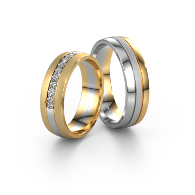 A beautiful set of three-tone wedding rings in which three colors seem to collide in one design. And these rings can be customized to your liking! The combination of these three colors symbolizes the unique love you share. Truly wonderful! This set of 2 color mat/shiny wedding rings consists of unique three-tone WH0413LM26APM wedding rings according to your own design, which our expert goldsmith crafts in our own artisan studio. The wedding band for men has a width of ±0.24 in (6 mm), the women's ring has a width of ±0.24 in (6 mm). The specific ring as shown here is set with diamond 0.18 crt. Because your wedding day must be adorned with nothing but the most beautiful gemstone. Wouldn't you agree?You can choose the combination of precious metals of your preference in our online tool. Anything goes! It is wise to browse through the characteristics of each different precious metal. For example, gold and silver are softer metals. Carat is determined by the amount of added extra metals. If the goldsmith doesn't add a lot, carat is higher and the wedding rings will be softer. If he adds more metals, the jewel has a lower amount of carat. A softer precious metal can still be used for your traditional wedding rings! If you prefer a precious metal which will last a lifetime, we recommend platinum. This is the most solid and durable metal our goldsmith uses.Because we design and deliver our own wedding rings, we can offer you wedding rings at a price you won't find anywhere else. A ring is made to order, which helps prevent excess supplies, so we can make you a great price offer.To make it easier for you, we offer a 30 day return policy. Check our terms and conditions.