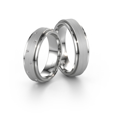 If you are in the market for exclusive white gold wedding rings with diamond 0.12 crt and a remarkable appearance, then you should seriously consider these rings. These exclusive WH2134LM wedding rings are true works of art! The ornaments are crafted by our expert goldsmith with great passion and a lot of patience. In order to create this ring with such precision, this craft requires a keen eye and a skillful hand. A challenge which ignites a fire in our expert goldsmith. Because these heavy wedding rings can be customized, you are able to transform these wedding rings into exclusive rings. Stunning rings which symbolize your unique relationship. The wedding band for men has a width of ±0.24 in (6 mm), the women's ring has a ±0.24 in (6 mm) width and this specific ring, as shown here, is set with diamond. The exquisite diamonds are set in such a way that they sparkle even brighter. This gives the ring a glamorous appearance. Due to its natural gemstones, which were selected especially for this ring, the ring itself is already unique. You can choose the combination of precious metals of your preference in our online tool. Anything goes! It is wise to browse through the characteristics of each different precious metal. For example, gold and silver are softer metals. Carat is determined by the amount of added extra metals. If the goldsmith doesn't add a lot, carat is higher and the wedding rings will be softer. If he adds more metals, the jewel has a lower amount of carat. A softer precious metal can still be used for your exclusive wedding rings! If you prefer a precious metal which will last a lifetime, we recommend platinum. This is the most solid and durable metal our goldsmith uses.After receiving your order, our goldsmiths will start the creative process of making your wedding rings. We don't keep stock. This is advantageous because these costs will not be passed on to you. Therefore, our quality wedding rings are always priced 30 percent lower than those of other jewelers.To make it easier for you, we offer a 30 day return policy. Check our terms and conditions.