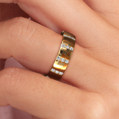If you are looking for an exclusive, design weddings ring with an exquisite look, this ring is perfect for you. Because it can be customized to your style, this weddings ring can be turned into a unique, exclusive piece of jewelry. This design ladies weddings ring is a perfect combination of ancient craftsmanship, love, passion and the latest modern techniques. This design Juul weddings ring is set with zirconia 1.5 mm, is ±0.20 in (5 mm) wide and has a shiny finish. After designing your ring, our jewel designer will start working on it. He will make a graphic 3D design of your weddings ring. This can also be used to make a dummy ring. Simply order a dummy ring and see for yourself how your ring will turn out. Subsequently, our expert goldsmith will create your ring in our own artisan studio. We use eco-friendly gold, so you get a ring, we are proud of, which looks good inside and out. You can also send us your own gold. Because we create your ring by hand, we can use your own gold. Our goal is to create an exquisite sparkling weddings ring just as envisioned it!Do you have special preferences regarding your weddings ring? For instance, a smaller or a wider band? Or perhaps a shiny or a matte ring? There are numerous variations possible. You can always discuss the possibilities with our jewelry designers. If you have certain wedding rings in mind, our designers will gladly help by drawing the rings of your dreams. Be sure to contact us!Because we design and deliver our own wedding rings, we can offer you wedding rings at a price you won't find anywhere else. A ring is made to order, which helps prevent excess supplies, so we can make you a great price offer.To make it easier for you, we offer a 30 day return policy. Check our terms and conditions.