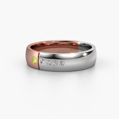 What a perfect combination of two different precious metals. They seem to reinforce each other in the modern design of this ring! Our goldsmith would be honored to create a unique ring for you, customized to your liking. Each ladies wedding ring we offer is artfully crafted by hand in our own artisan studio. That makes it possible for us to turn modern into reality and helps create your own personal ring, customized to your style. This modern WH1101L25SAMP ladies wedding ring is set with round peridot, is ±0.20 in (5 mm) wide and has a mat/shiny finish.