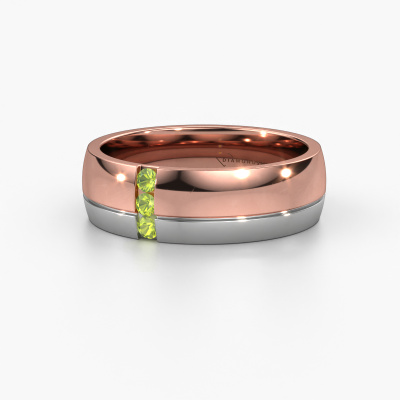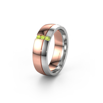 A unique two-tone rose gold ladies wedding ring, designed by you, and then artfully crafted by our goldsmith in our own artisan studio! A beautiful symbol, reflecting your love, which you carry with you for a lifetime! Each ring we offer is artfully forged by hand in our own crafting studio. This makes it possible for us to create you a ring which is customized to your liking, completely shiny your style. This modern WH0223L56A wedding ring is set with peridot, is ±0.24 in (6 mm) wide and has a shiny finish. The jewel designer, member of a specialized team, will make a graphic 3D design of your wedding ring. If it pleases you, you can also order a ring dummy so you can try it on and see your ring before creation. Subsequently, our goldsmith will create your unique wedding ring with great care in our own crafting studio. A meticulous job, because both creating as well as finishing your ring requires a keen eye. And that is what makes our craft special. Your unique wedding ring is the result of true passionate craftsmanship!By the way, you can be inspired by this wedding ring and have it further adjusted to your taste. Do you prefer a smaller band or a wider one? Do you prefer a shiny ring or a matte one? Anything is possible. Also, if you have an idea of your own for extraordinary wedding rings, or if you have seen a beautiful set somewhere else that you really like and would like to have adjusted to your personal taste: no problem! don't hesitate to contact us. Our designers will gladly discuss your possibilities with you!After receiving your order, our goldsmiths will start the creative process of making your wedding rings. We don't keep stock. This is advantageous because these costs will not be passed on to you. Therefore, our quality wedding rings are always priced 30 percent lower than those of other jewelers.To make it easier for you, we offer a 30 day return policy. Check our terms and conditions.