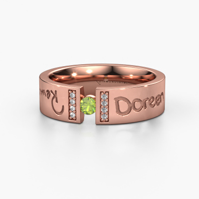 A unique wedding ring with peridot! What makes this ladies wedding ring WH2094L16C special, is that you can have it engraved with a special text, which has meaning to you. A word, a short phrase or part of the lyrics to a song. Whichever text is most meaningful to you. Memorialize it as an exquisite engravement on this modern wedding ring. This own Text ladies wedding ring has an ±0.24 in (6 mm) width. You can choose the combination of precious metals of your preference in our online tool. Anything goes! It is wise to browse through the characteristics of each different precious metal. For example, gold and silver are softer metals. Carat is determined by the amount of added extra metals. If the goldsmith doesn't add a lot, carat is higher and the wedding ring will be softer. If he adds more metals, the jewel has a lower amount of carat. A softer precious metal can still be used for your modern wedding ring! If you prefer a precious metal which will last a lifetime, we recommend platinum. This is the most solid and durable metal our goldsmith uses.This wedding ring can also serve as a source of inspiration. Would you like the ring to have a matte or shiny finish (at no additional cost), or would you prefer it to be wider or narrower? Anything is possible. Because there are countless variations, we can’t show everything on our website. Do you have an idea for beautiful wedding rings, or have you seen a stunning set of wedding rings elsewhere? Feel free to contact us; our designers are ready to assist you.By combining our modern techniques with ancient crafting, we can design and customize the finest quality jewels with the utmost care for you at the best price. Our wedding rings are always priced 30% lower than those of other jewelers. We make wedding rings to order so we don't have to maintain a large stock.To make it easier for you, we offer a 30 day return policy. Check our terms and conditions.