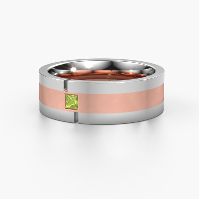 An extraordinary 2 color ladies wedding ring! As unique as your relationship! No two people are alike and that is why you want a unique wedding ring. This exclusive WH2042P wedding ring is made by our jewel designers and crafted by hand by our goldsmith. In that process, We use pure craftsmanship combined with the latest techniques to achieve the best result. Our goldsmith strives for absolute perfection. A unique, handmade wedding ring, made to memorialize your big day! This exclusive WH2042P wedding ring is set with peridot, is ±0.28 in (7 mm) wide and has a shiny finish. The jewel designer, member of a specialized team, will make a graphic 3D design of your wedding ring. If it pleases you, you can also order a ring dummy so you can try it on and see your ring before creation. Subsequently, our goldsmith will create your unique wedding ring with great care in our own crafting studio. A meticulous job, because both creating as well as finishing your ring requires a keen eye. And that is what makes our craft special. Your unique wedding ring is the result of true passionate craftsmanship!Do you have specific wishes? Like a shiny ring, or a matte one? A wider band, or a smaller one? The possibilities of this wedding ring are endless. Be sure to contact our designers to adjust your ring to your personal taste. Did you see a ring somewhere, or do you have some special ideas of your own? Then don't hesitate to contact our designers and discuss your ideas for your own set of beautiful wedding rings. We are up for the challenge of creating the ring exactly the way you want it!After receiving your order, our goldsmiths will start the creative process of making your wedding rings. We don't keep stock. This is advantageous because these costs will not be passed on to you. Therefore, our quality wedding rings are always priced 30 percent lower than those of other jewelers.To make it easier for you, we offer a 30 day return policy. Check our terms and conditions.