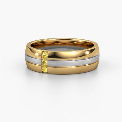 What a perfect combination of two different precious metals. They seem to reinforce each other in the modern design of this ring! Our goldsmith would be honored to create a unique ring for you, customized to your liking. Each ladies wedding ring we offer is artfully crafted by hand in our own artisan studio. That makes it possible for us to turn modern into reality and helps create your own personal ring, customized to your style. This modern WH0426L26A ladies wedding ring is set with round yellow sapphire, is ±0.24 in (6 mm) wide and has a mat/shiny finish. The jewel designer, member of a specialized team, will make a graphic 3D design of your wedding ring. If it pleases you, you can also order a ring dummy so you can try it on and see your ring before creation. Subsequently, our goldsmith will create your unique wedding ring with great care in our own crafting studio. A meticulous job, because both creating as well as finishing your ring requires a keen eye. And that is what makes our craft special. Your unique wedding ring is the result of true passionate craftsmanship!Do you have special preferences regarding your wedding ring? For instance, a smaller or a wider band? Or perhaps a shiny or a matte ring? There are numerous variations possible. You can always discuss the possibilities with our jewelry designers. If you have certain wedding rings in mind, our designers will gladly help by drawing the rings of your dreams. Be sure to contact us!After receiving your order, our goldsmiths will passionately start the creative process of making your wedding rings in our own artisan studio. Because we do not maintain a large stockpile, we can offer our jewelry at a lower price than other jewelers. Our pricing is proof of that! We offer top quality jewels at lowest price, guaranteed.To make it easier for you, we offer a 30 day return policy. Check our terms and conditions.